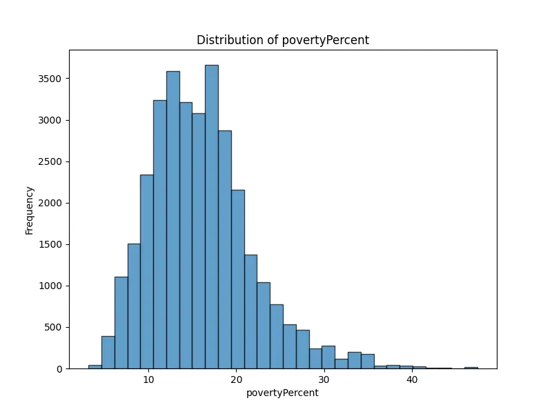 Then, I examined distribution plots for some of the numeric columns (e.g., incidenceRate, deathRate, povertyPercent) to understand trends. Using Python, I generated visualizations for these columns.